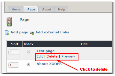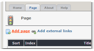 The Page tab allows the administrator to add, modify, and delete related information pages.